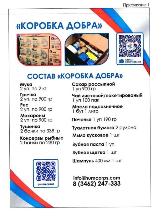 Важно, что приём гуманитарной помощи осуществляется строго по перечням, содержащим наименования и массу позиций (Приложение 1 — «Коробка Добра», Приложение 2 — «Посылка солдату»). Приветствуется вложение детских писем/рисунков с добрыми пожеланиями.