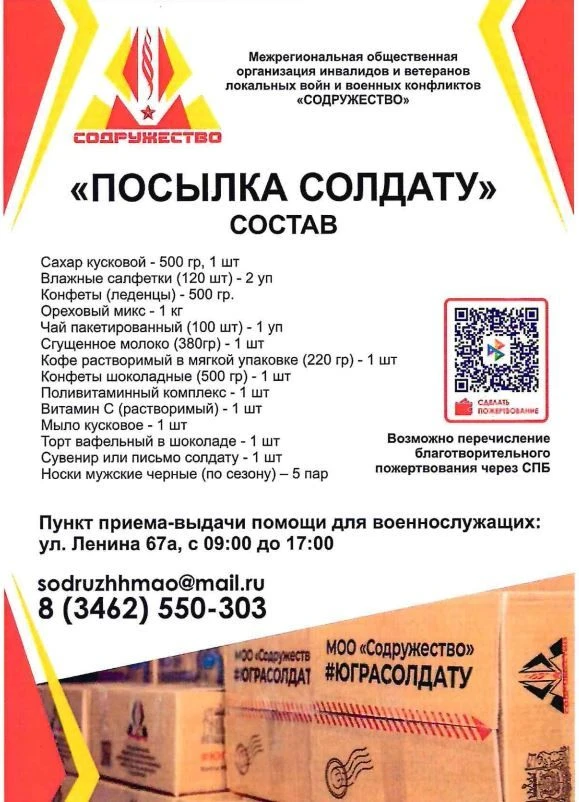 - Индивидуальные наборы «Посылка солдату» — продукты длительного хранения, средства гигиены, сезонные носки; в каждый набор включается детское письмо/рисунок с поддержкой от учащихся ХМАО - Югры.