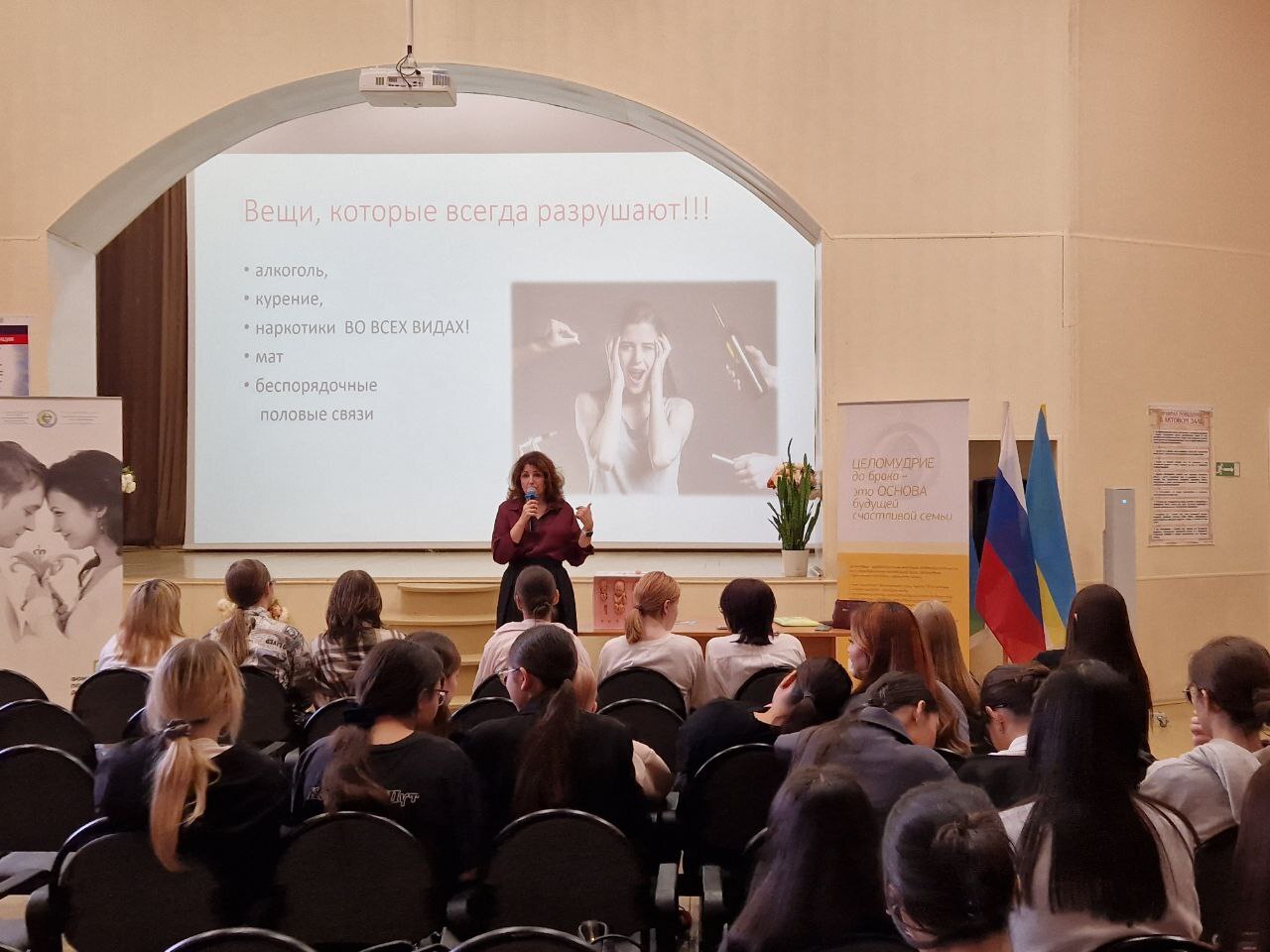 Марианна Юрьевна поговорила с девочками о ценности жизни, целомудрии, важности создания семьи, сохранения любви и верности в браке, о здоровом образе жизни, недопустимость ранних половых отношений , сожительства, о физические и психологических последствии прерывания беременности (абортов).