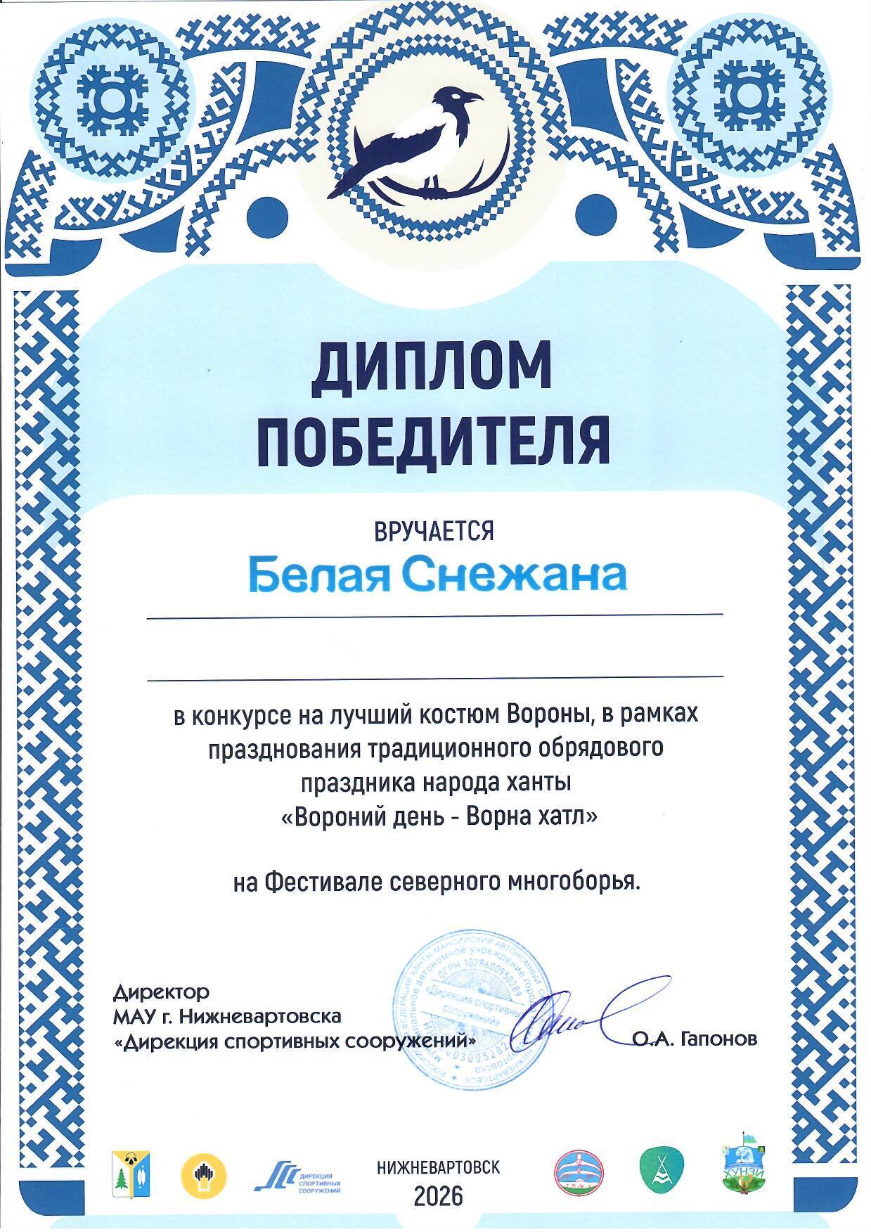 Белая Снежана, обучающаяся 5 "Б" класса, стала победителем в конкурсе на лучший костюм Вороны, в рамках празднования традиционного обрядового праздника народа ханты "Вороний день - Ворона Хатл".
